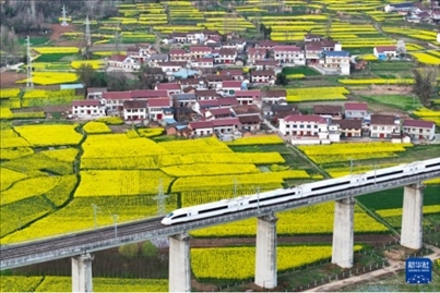 眼下,陜西漢中市百萬畝油菜花競相綻放,西成高鐵線上,一趟趟列車穿行在金黃色的油菜花海之中,為秦巴山區(qū)勾畫出朝氣蓬勃的春日景象。
