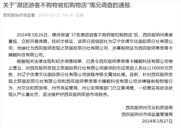 ·云南西雙版納通報“37名跟團游客不購物被扣購物店”調(diào)查情況:立案調(diào)查。