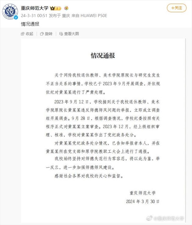 ·重慶師大通報(bào)“美院原院長與學(xué)生有不正當(dāng)關(guān)系”:黨紀(jì)政務(wù)處分。