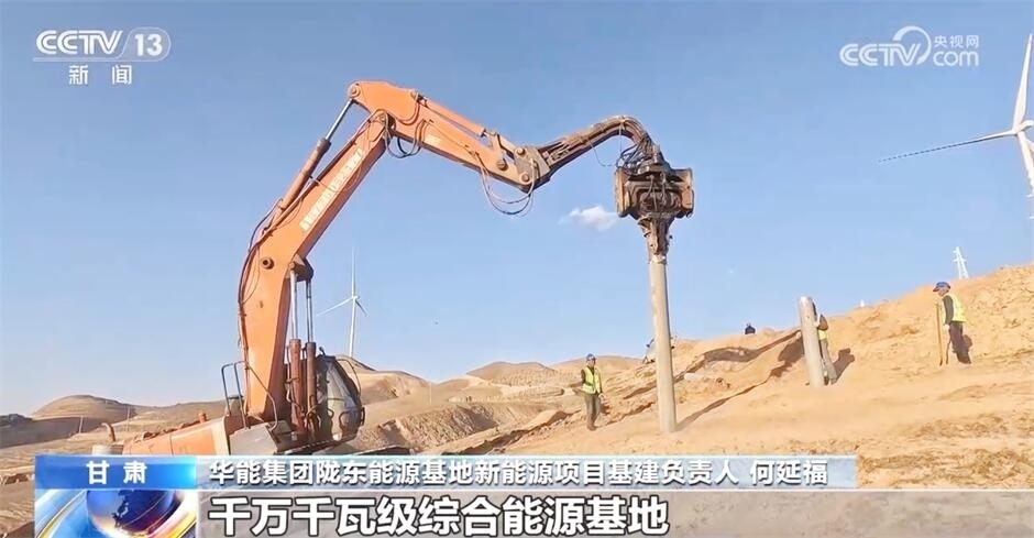在我國首個(gè)千萬千瓦級(jí)多能互補(bǔ)綜合能源基地——華能隴東能源基地,施工現(xiàn)場一片繁忙景象。目前,基地已建成投產(chǎn)100萬千瓦容量,在建500萬千瓦容量。