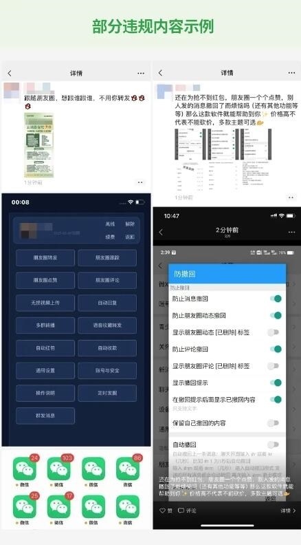 3月26日,微信安全中心發(fā)布《針對(duì)在微信使用“外掛”行為的打擊公告》,《公告》指出,根據(jù)《微信個(gè)人賬號(hào)使用規(guī)范》規(guī)定,微信明確禁止使用各類(lèi)“外掛”。但近期發(fā)現(xiàn),有部分用戶存在多次違規(guī)使用“外掛”軟件,或在朋友圈發(fā)布“外掛”售賣(mài)信息的行為。對(duì)此,微信安全團(tuán)隊(duì)進(jìn)行了專(zhuān)項(xiàng)清理,并將持續(xù)加大清理力度。