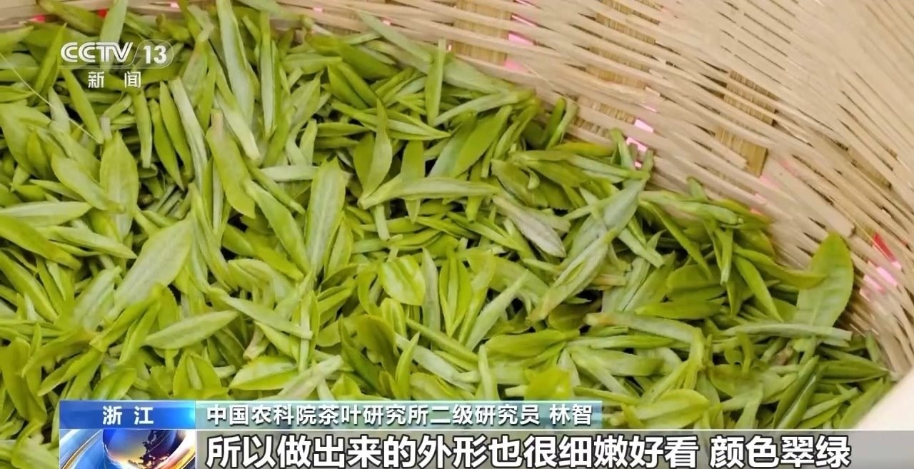 中國(guó)農(nóng)科院茶葉研究所二級(jí)研究員 林智:所以它有幾個(gè)特點(diǎn),第一個(gè)就是好看,為什么說好看呢,因?yàn)榇禾觳璧难咳~比較細(xì)嫩,所以也比較金貴,做工一般都比較講究,做出來的外形也很細(xì)嫩好看,顏色翠綠。