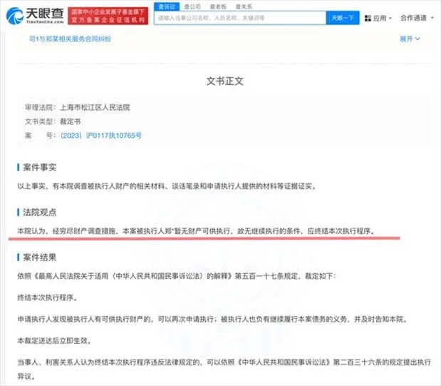·近日,演員鄭爽與海寧東開之星影視投資有限公司合同糾紛案件新增執(zhí)行裁定書。經(jīng)窮盡財產(chǎn)調(diào)查措施,法院認定鄭爽無財產(chǎn)可供執(zhí)行。