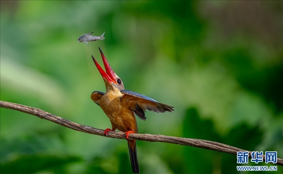 鸛嘴翡翠進食瞬間(3月30日攝)。新華網(wǎng)發(fā)(朱邊勇 攝)