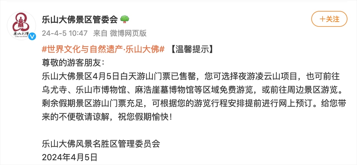 而據(jù)樂(lè)山大佛景區(qū)管委會(huì)發(fā)布的公告,4月4日15:04,樂(lè)山大佛景區(qū)當(dāng)日的白天游山門票已售罄;4月5日10:47,樂(lè)山大佛景區(qū)當(dāng)日的白天游山門票就已售罄。