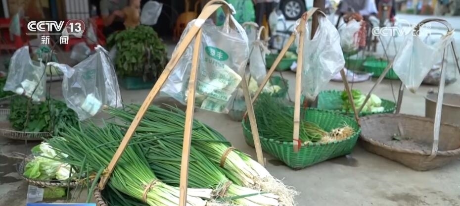 一大早,78歲的李蘭英就開始到地里忙活,澆水、除草、摘菜,手腳十分麻利。摘了兩大籃子的菜,她洗凈扎好,用扁擔(dān)挑起前往路口的超市。這里距離她的菜地只有200米,走路過來也就幾分鐘,超市門口的這片小空地此時(shí)已經(jīng)滿滿當(dāng)當(dāng)擺滿了30來筐的新鮮蔬菜。