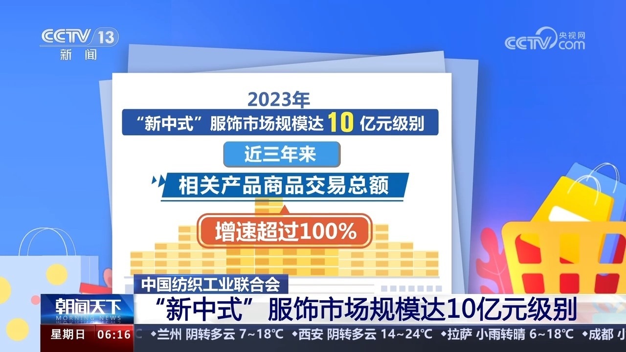 中國紡織工業(yè)聯(lián)合會(huì)數(shù)據(jù)顯示,2023年“新中式”服飾市場規(guī)模達(dá)10億元級別,近三年來,相關(guān)產(chǎn)品商品交易總額增速超過100%。今年1月以來,在互聯(lián)網(wǎng)銷售平臺上“新中式”“宋錦”的搜索量環(huán)比分別增長近6倍和近20倍。