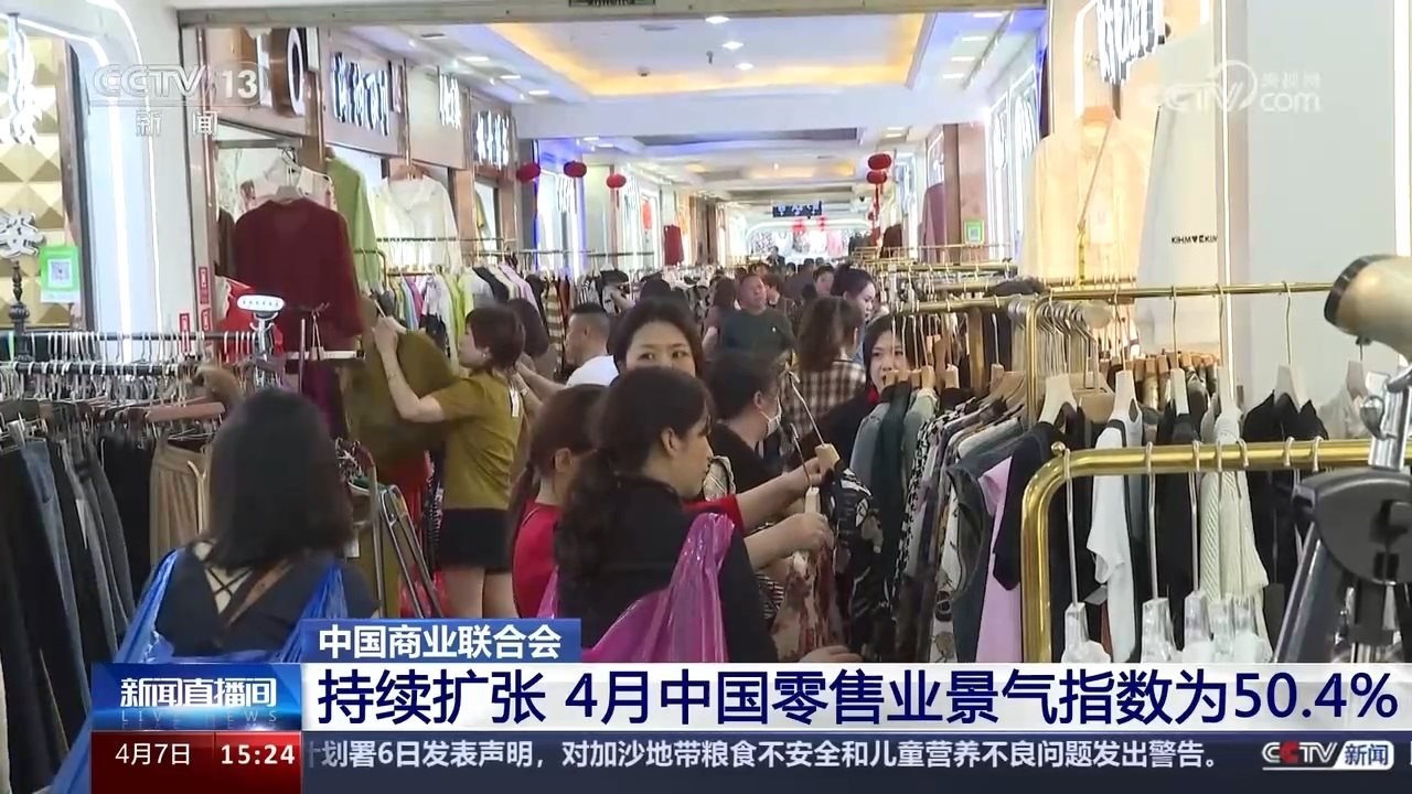 央視網(wǎng)消息:中國商業(yè)聯(lián)合會最新發(fā)布的中國零售業(yè)景氣指數(shù)顯示,4月份,中國零售業(yè)景氣指數(shù)為50.4%,連續(xù)一年維持在擴張區(qū)間。全國商品經(jīng)營類企業(yè)對4月份盈利增長恢復(fù)的預(yù)期開始好轉(zhuǎn)。