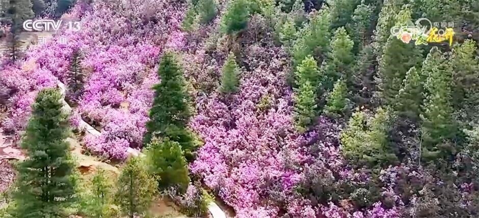 跟隨鏡頭,我們來到云南省怒江州蘭坪縣,在海拔2810米的啦井鎮(zhèn)期井村,漫山遍野的野生杜鵑花競(jìng)相綻放。馬纓杜鵑、團(tuán)花杜鵑、假乳黃杜鵑、猴頭杜鵑……山谷里、山坡上,紅的、粉的、黃的,層層疊疊開滿枝頭,隨著山勢(shì)起伏跌宕,仿佛浪潮一般,形成了天然的花海。