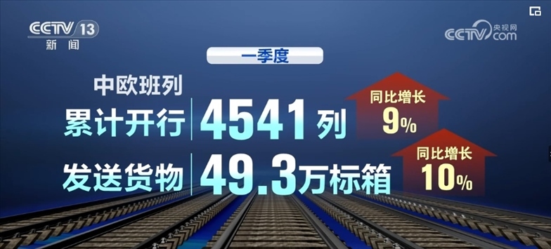 數(shù)據(jù)顯示,一季度中,歐班列累計開行4541列,發(fā)送貨物49.3萬標箱,同比分別增長9%、10%。