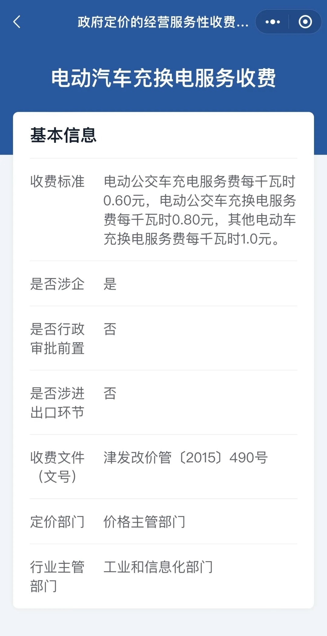 點擊定價項目名稱,就會看到具體的收費標準、收費文件、定價部門、行業(yè)主管部門、是否涉企等多項信息。