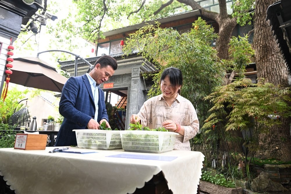 2024年4月11日,在江蘇省蘇州市吳中區(qū)金庭鎮(zhèn),退捕漁民沈雪榮和妻子沈燕燕在自家經(jīng)營的農(nóng)家樂“美味漁家蟹園”擇菜?!巴瞬逗螅纳鷳B(tài)環(huán)境越來越好,游客越來越多,我們家的農(nóng)家樂生意也越來越紅火?!鄙蜓s感慨道。