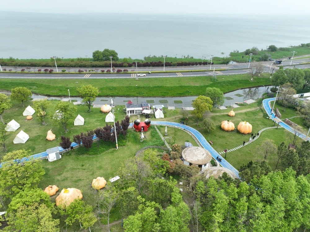 2024年4月11日,浙江省湖州市吳興區(qū)綜合行政執(zhí)法局高新區(qū)中隊執(zhí)法人員駕車在太湖沿岸巡查(無人機照片)。