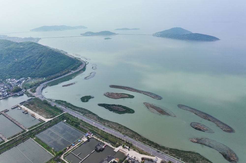 這是江蘇省蘇州市吳中區(qū)金庭鎮(zhèn)環(huán)太湖濕地帶修復(fù)項目(2024年4月11日攝,無人機照片)。