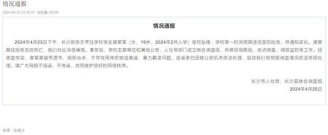 ·湖南長沙縣通報(bào)“女生跳樓身亡”:不存在網(wǎng)傳被造黃謠、暴力霸凌問題,造謠者已被依法處理。