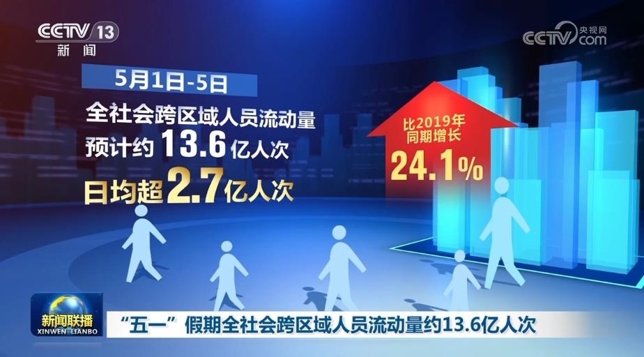 初步統(tǒng)計(jì)顯示,5月1日—5日,全社會(huì)跨區(qū)域人員流動(dòng)量預(yù)計(jì)約13.6億人次,日均超2.7億人次,比2019年同期增長24.1%。