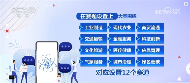 在賽題設置上,大賽圍繞工業(yè)制造、現代農業(yè)、商貿流通、交通運輸、金融服務、科技創(chuàng)新、文化旅游、醫(yī)療健康、應急管理、氣象服務、城市治理、綠色低碳12個行業(yè)及領域,對應設置12個賽道。