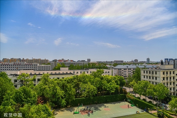 5月14日中午,北京南方天空出現(xiàn)罕見的環(huán)地平弧天象,彩虹一般的七彩祥云下市民正在球場上運動。