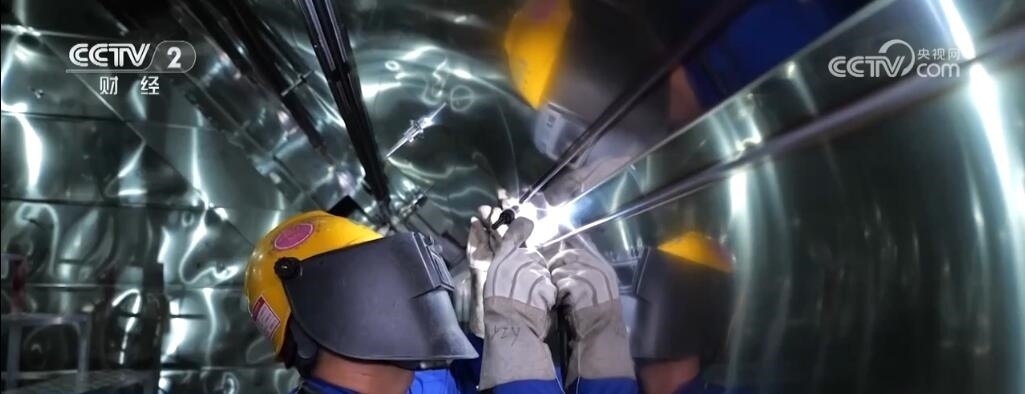上海市長興島造船基地,記者身后的巨輪是我國新一代天然氣運輸船“綠能瀛”,它總長299米,寬度是46.4米,這一艘船的用鋼量就達到了25000噸,其甲板面積相當于3個標準足球場,可裝載17.4萬立方米液化天然氣,能夠滿足700萬個家庭一個月的用氣需求。