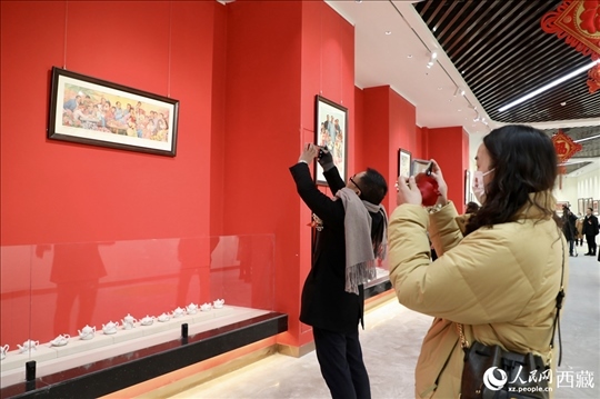 觀眾欣賞由西藏自治區(qū)延安精神研究會主辦的“紅色記憶”中國年畫展。人民網(wǎng)記者 次仁羅布攝