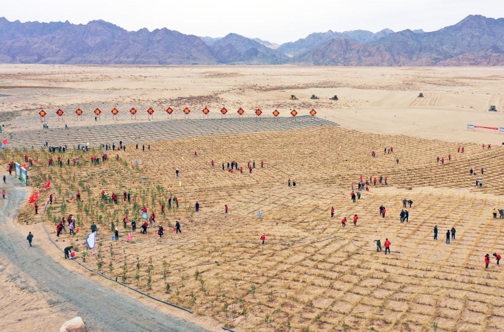 阿拉善盟位于內(nèi)蒙古最西部,盤踞在此的騰格里沙漠、巴丹吉林沙漠、烏蘭布和沙漠有連片之憂。阿拉善盟林草局局長(zhǎng)圖布新說(shuō),一開春,阿拉善盟即全面啟動(dòng)規(guī)劃治沙總面積達(dá)621.3萬(wàn)畝的內(nèi)蒙古西部荒漠綜合治理項(xiàng)目(二期),目前已有168個(gè)作業(yè)區(qū)開工,累計(jì)完成治沙面積340余萬(wàn)畝。
