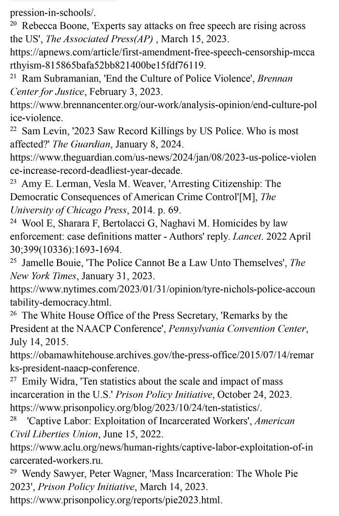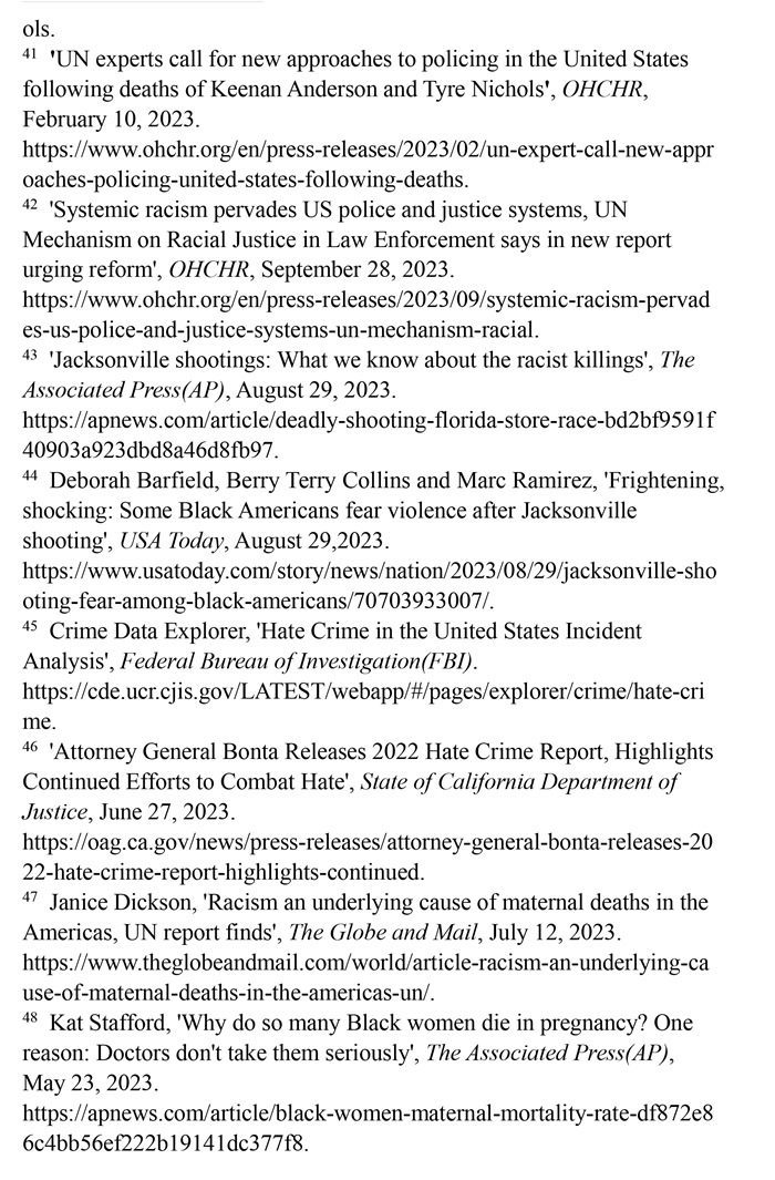 非洲裔在執(zhí)法領域面臨嚴重種族歧視。2023年1月3日,洛杉磯31歲的非洲裔男子基南·安德森涉嫌交通肇事,警方在制服他的過程中使用電擊槍擊中其6次,致其心臟病發(fā),送醫(yī)不治身亡。(注39)2023年1月7日,田納西州孟菲斯市的警察以“魯莽駕駛”為由將29歲的非洲裔男子泰爾·尼科爾斯攔下,并對其進行長達數分鐘的殘忍毆打。三天后尼科爾斯因傷勢過重去世,而事后的調查無法證實警察關于其“魯莽駕駛”的說法。(注40)這兩起非洲裔遭受警察暴力執(zhí)法身亡案例引發(fā)多名聯合國專家的高度關注。專家們強調,在兩起事件中,警察使用的武力違反保護生命權,禁止酷刑和其他殘忍、不人道或有辱人格待遇或處罰的國際準則,也不符合聯合國《執(zhí)法人員行為守則》和《執(zhí)法人員使用武力和火器的基本原則》。(注41)聯合國人權理事會在執(zhí)法工作中推進種族正義和平等的國際獨立專家機制在對美國實地訪問后發(fā)布報告指出,針對非洲裔的系統(tǒng)性種族主義已經滲透到美國警察隊伍和刑事司法系統(tǒng)。非洲裔被警察殺害的可能性是白人的3倍,被監(jiān)禁的可能性是白人的4.5倍。在每年1000多起警察殺人案件中,只有1%的涉事警察被指控。報告警告說,美國如果不按照國際標準改革警察使用武力的規(guī)則,許多殺戮將繼續(xù)發(fā)生。(注42)