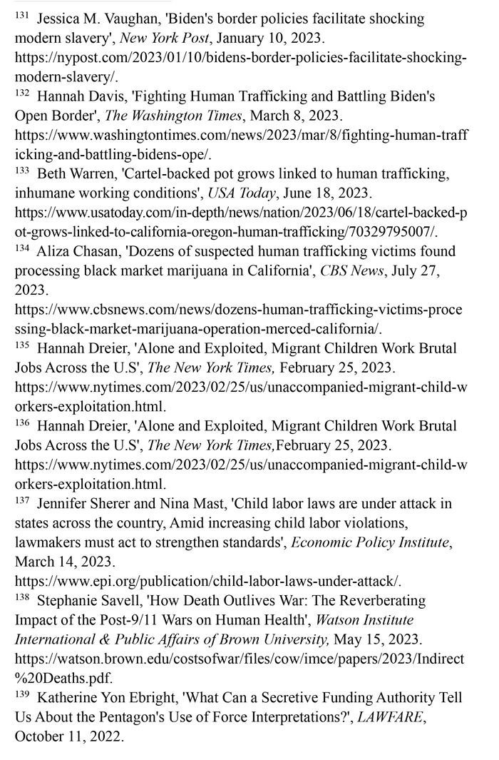 邊境政策助長現代奴隸制。美國政府的邊境政策加劇人口販運問題。被遺棄在邊境州城鎮(zhèn)或被運往全國各地的移民,往往處于孤立無援境地,最容易受到剝削和販運。那些非法越境后聚集在擁擠、缺乏監(jiān)管的庇護所的兒童也成為人口販子的獵物。(注131)在美國被販運的人中,72%是移民,其中大部分是通過偷渡入境,人口販運的受害者多是婦女和兒童。打擊販賣婦女聯盟的一項研究估計,60%的越境無人陪伴移民兒童被犯罪集團強迫從事兒童色情甚至販毒活動。(注132)《今日美國報》網站2023年6月18日報道,移民被販毒集團誘騙到加利福尼亞州北部和俄勒岡州南部的農場從事大麻種植,遭受奴役和強迫勞動。被販賣的移民在大麻農場遭持槍恐嚇,每天被迫工作16個小時甚至更長時間,有時連飯都吃不上。移民婦女遭到性侵犯,有些人被謀殺,尸體被丟棄在荒野中。(注133)美國哥倫比亞廣播公司新聞網2023年7月27日報道,近60名遭人口販運的受害者被偷運到加利福尼亞中部的一個非法大麻種植場所,被強迫加工大麻,向偷運者償還債務。(注134)
