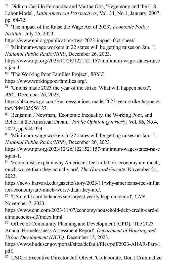 “工作者貧困”問題突出。美國勞動力市場狀況發(fā)生了結構性變化,低薪崗位和缺乏監(jiān)管普遍存在。(注77)有大批“工作窮人”終日勞作,其工資水平卻難以維持基本生計,還缺乏應有的社會保障。美國聯邦最低時薪標準自2009年以來一直沒有上調。(注78)美國勞工部的數據顯示,2023年仍有20個州維持聯邦最低時薪標準。(注79)美國有1150萬個低收入工薪家庭,包括1480萬兒童在內的2990多萬美國人生活在這些低收入工薪家庭。(注80)勞資收入增長懸殊導致多行業(yè)大面積罷工。2023年,美國發(fā)生了21世紀以來波及范圍最廣的罷工潮,包括影視、制造、醫(yī)療、媒體在內的多個行業(yè)都出現大規(guī)模罷工。(注81)加利福尼亞州大學公共政策與政治學院副教授本杰明·紐曼評論稱,陷入結構性貧困之中的“工作窮人”既缺乏機會平等,也難以向上流動,他們極大地降低了對“美國夢”的信念。(注82)