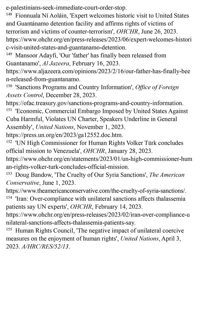 長期濫施單邊制裁造成嚴重人道主義后果。自1950年以來,美國使用的制裁次數居全球之首。根據美國財政部2023年12月28日公布的數據,美國制裁的國家超過20個。(注150)第78屆聯合國大會發(fā)言人2023年11月1日指出,美國對古巴實施的經濟、商業(yè)和金融封鎖違反了《聯合國憲章》,對古巴人民造成了毀滅性影響。(注151)聯合國大會2023年11月2日通過決議,再次敦促美國終止對古巴長達60多年的經濟、商業(yè)和金融封鎖,這是聯合國大會連續(xù)第31年通過類似決議。2023年1月28日,聯合國人權事務高級專員沃爾克·圖爾克在訪問委內瑞拉后表示,2017年以來美國施加的制裁加劇了委內瑞拉的經濟危機,嚴重阻礙人權的實現。(注152)“美國保守派”網站2023年6月1日報道,美國制裁進一步加劇了敘利亞人民的貧困。敘利亞70%的人口面臨食物短缺,其中1200萬人三餐不繼,290萬人食不果腹。(注153)聯合國人權理事會單邊強制措施對人權負面影響問題特別報告員阿萊娜·杜晗2023年2月14日指出,美國對伊朗的制裁減少了地中海貧血癥患者從國外進口救命藥物的機會,導致伊朗患者的并發(fā)癥和死亡率增加,是對健康權的侵犯。(注154)聯合國人權理事會2023年4月3日通過決議指出,單邊強制性措施會對目標國家廣大民眾的人權產生深遠影響,對窮人和處境最脆弱的人影響尤為嚴重。決議譴責某些大國繼續(xù)單方面適用單邊強制性措施。美國在該決議表決中投了反對票。(注155)