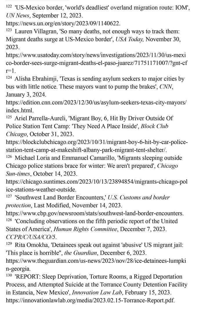 入境移民遭受酷刑及其他不人道待遇。2023財年,在美國南部邊境遭逮捕或驅逐的移民總數達240多萬人,再創(chuàng)歷史新高。(注127)聯合國人權事務委員會對移民在美國受到長時間的拘留表示擔憂,批評美國的拘留所條件惡劣,人滿為患,被拘押者無法獲得食物、水和醫(yī)療服務,導致包括兒童在內的許多人死亡;公共和私營移民拘留設施存在性暴力、長期單獨監(jiān)禁、虐待等侵犯人權問題。(注128)英國《衛(wèi)報》網站2023年12月6日報道,由美國私人監(jiān)獄公司CoreCivic運營的、位于佐治亞州蘭普金的斯圖爾特拘留中心存在長期單獨監(jiān)禁、性虐待、醫(yī)療疏忽以及強迫勞動等令人擔憂的問題。(注129)創(chuàng)新法律實驗室于2023年2月15日發(fā)布報告揭露,由CoreCivic運營的、位于新墨西哥州埃斯坦西亞的托蘭斯縣拘留所存在對被關押者實施酷刑現象。在夜間,每隔15分鐘就會有一名警衛(wèi)開著收音機的最大音量走過這些房間,大聲地敲著門,并用手電筒強光照進房間,吵醒任何可能睡著的人。在寒冷的天氣里,每個房間的通風管道整夜都在吹冷空氣。一些人試圖用衛(wèi)生紙或毯子蓋住通風口,但警衛(wèi)們拿走了用來阻擋冷空氣的任何東西。這些牢房里,廁所污水和糞便溢出,人們被迫睡在臭氣熏天的地板上。(注130)