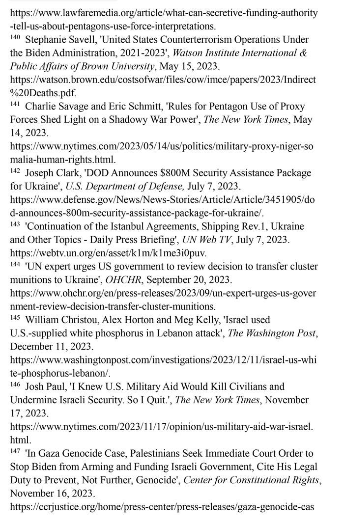 持續(xù)向沖突地區(qū)提供武器。美國國防部2023年7月7日發(fā)布的新聞稿顯示,美國向烏克蘭提供的價值8億美元的額外軍事援助中,包含大量集束彈藥。(注142)聯合國秘書長副發(fā)言人哈克2023年7月7日回答記者提問時表示,聯合國秘書長安東尼奧·古特雷斯希望各國遵守《集束彈藥公約》,不要在戰(zhàn)場上繼續(xù)使用集束彈藥。(注143)聯合國人權高專辦網站2023年9月20日報道,聯合國人權理事會酷刑和其他殘忍、不人道或有辱人格的待遇或處罰問題特別報告員愛麗絲·吉爾·愛德華茲2023年7月向美國政府發(fā)出緊急信函,警告集束彈藥會對平民造成嚴重傷害。(注144)《華盛頓郵報》網站2023年12月11日報道,美國每年流入以色列的軍火達數十億美元,以色列在10月對黎巴嫩南部的一次襲擊中使用了美國供應的白磷彈藥,造成至少9名平民受傷。(注145)美國國務院政治軍事事務局前局長喬?!けA_2023年10月18日在《紐約時報》網站發(fā)表專欄文章指出,美國每年向以色列提供至少38億美元軍事援助,加沙地帶最嚴重的人員傷亡大多是由美國提供的彈藥所導致,譴責這種軍事援助無視人權問題。(注146)美國人權組織“憲法權利中心”2023年11月16日報道,滅絕種族與死刑問題專家威廉·沙巴斯指責美國未能履行防止種族滅絕的法律義務,違反了習慣國際法和《防止及懲治滅絕種族罪公約》。(注147)