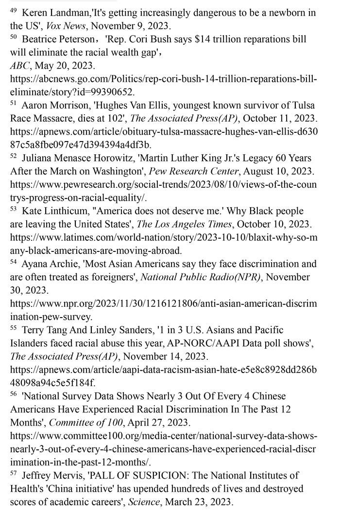 對亞裔的歧視變本加厲。皮尤研究中心2023年11月30日發(fā)布的調查結果顯示,近60%的亞裔美國人表示,他們因種族或族裔面臨歧視。(注54)美聯社參與的調查發(fā)現,51%的亞裔和太平洋島民認為種族主義在美國是一個“極端”或“非常嚴重”的問題。(注55)哥倫比亞大學社會工作學院與非政府組織“百人會”2023年4月27日聯合發(fā)布的調查報告顯示,有近四分之三的華裔美國人在近1年中遭受過種族歧視,55%的華裔美國人擔心仇恨犯罪或騷擾危及人身安全。(注56)