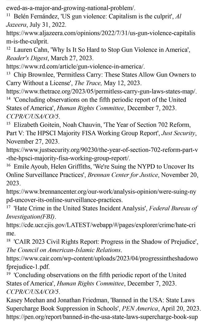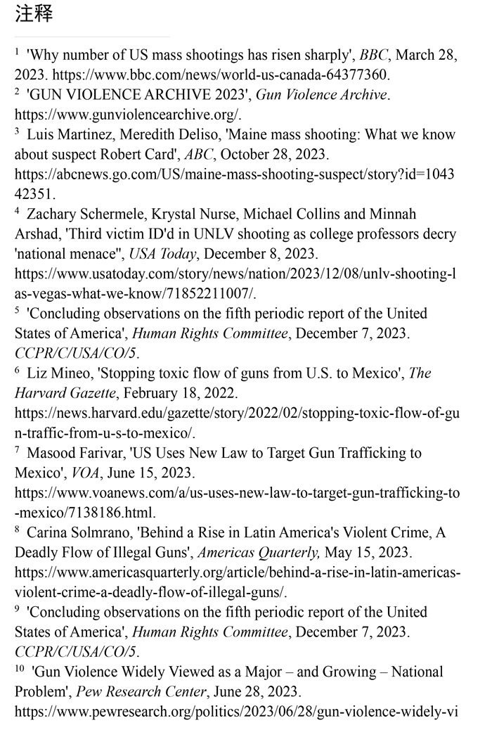 槍支暴力造成慘痛生命代價。數據顯示,美國所有類型的槍支暴力事件都呈上升趨勢。(注1)根據“槍支暴力檔案”網站統(tǒng)計的數據,2023年美國至少發(fā)生了654起大規(guī)模槍擊事件。槍支暴力導致近4.3萬人死亡,平均每天死亡117人。(注2)例如,美國廣播公司新聞網站2023年10月28日報道,緬因州發(fā)生大規(guī)模槍擊事件,造成至少18人死亡,13人受傷。(注3)《今日美國報》網站2023年12月6日報道,拉斯維加斯3名大學教授被一名前同事槍殺。美國大學教授協會主席艾琳·馬爾維稱,槍支暴力是“不可接受的國家威脅”,敦促美國政府進行槍支政策改革。(注4)美國與槍支有關的傷亡人數激增,引發(fā)聯合國人權事務委員會的嚴重關切。(注5)
