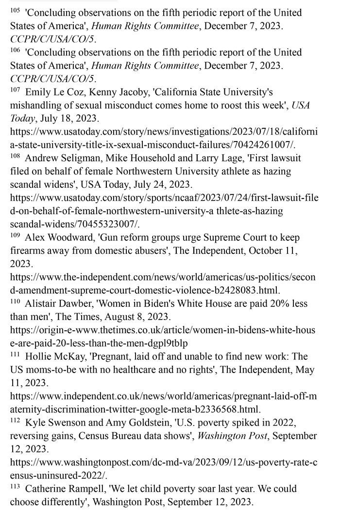 美國婦女兒童權利長期遭受系統(tǒng)性侵犯,保障性別平等的憲法規(guī)定付之闕如,至今未批準聯合國《消除對婦女一切形式歧視公約》,而且是聯合國會員國中唯一沒有批準《兒童權利公約》的國家。美國參議院2023年4月否決了保障性別平等的憲法修正提案。美國每年約有5.4萬名婦女因遭受懷孕歧視而失業(yè)。超過220萬育齡婦女無法獲得產科護理。至少有21個州命令禁止或嚴格限制墮胎。孕產婦死亡人數近20年來增加了一倍多。職場、校園、家庭等多領域的性暴力層出不窮。兒童的生存權與發(fā)展權堪憂。大量兒童被排除出醫(yī)療補助計劃。槍支暴力成為兒童死亡的主要原因。毒品濫用在青少年群體中蔓延。46個州被發(fā)現瞞報約3.48萬例寄養(yǎng)兒童失蹤案件。