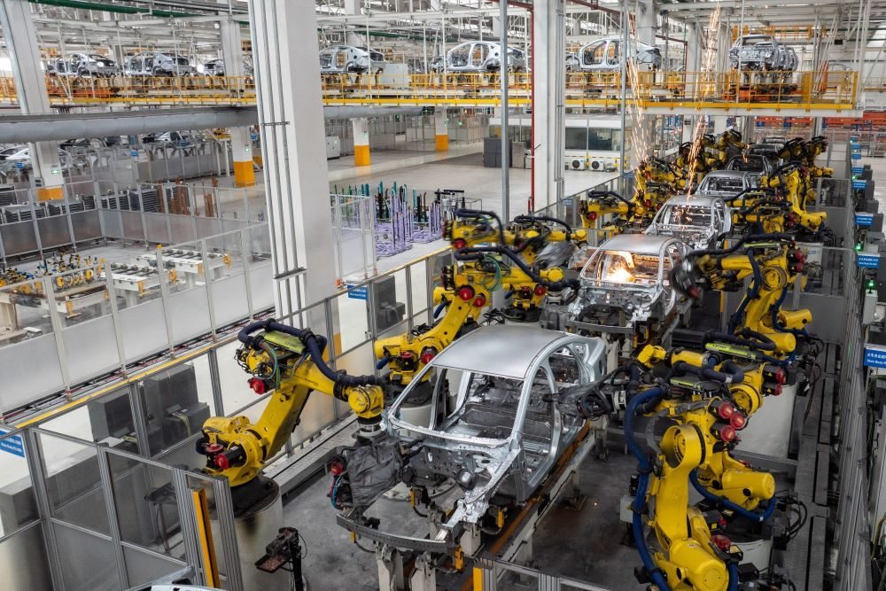 2024年3月21日,比亞迪湖南長(zhǎng)沙雨花工廠機(jī)械臂在焊接車身。