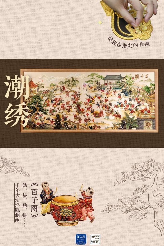 潮繡,屬我國(guó)四大名繡中的粵繡門派,最大的特點(diǎn)是立體墊高,以繡藝精美細(xì)致、構(gòu)圖均衡飽滿著稱,色彩亮麗又具立體感。