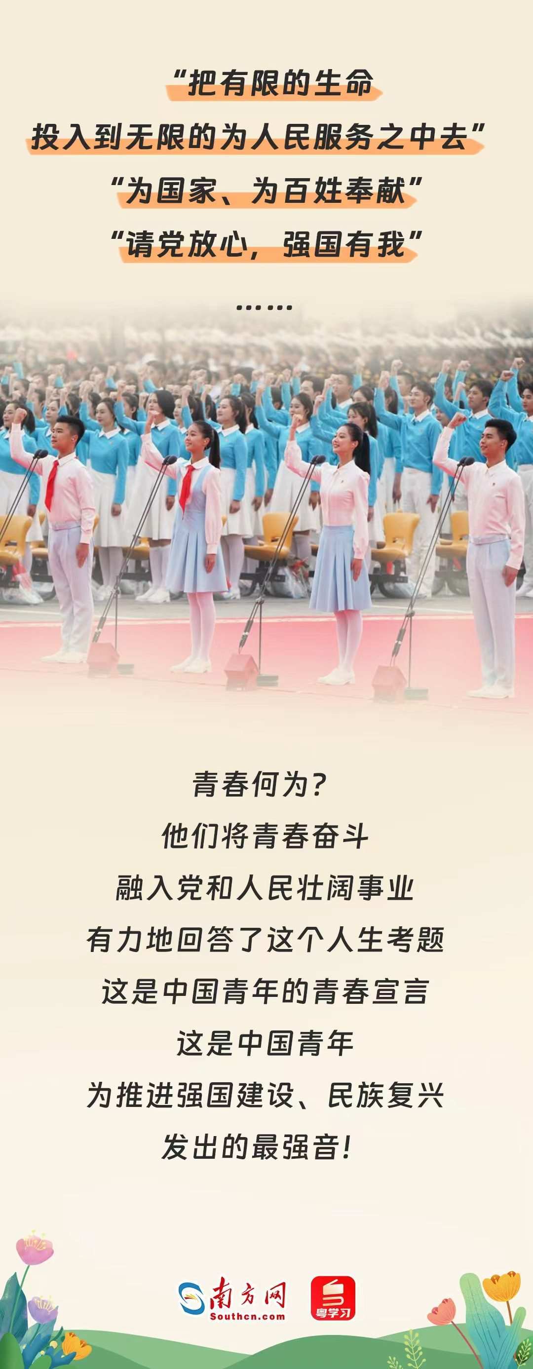 時(shí)代的每一次前行,都閃耀著青年奮勇拼搏的身影。一代又一代的中國(guó)青年滿懷對(duì)祖國(guó)和人民的赤子之心,積極投身黨領(lǐng)導(dǎo)的偉大事業(yè),為人民戰(zhàn)斗、為祖國(guó)獻(xiàn)身、為幸福生活?yuàn)^斗,用行動(dòng)奮力踐行著自己的青春宣言。