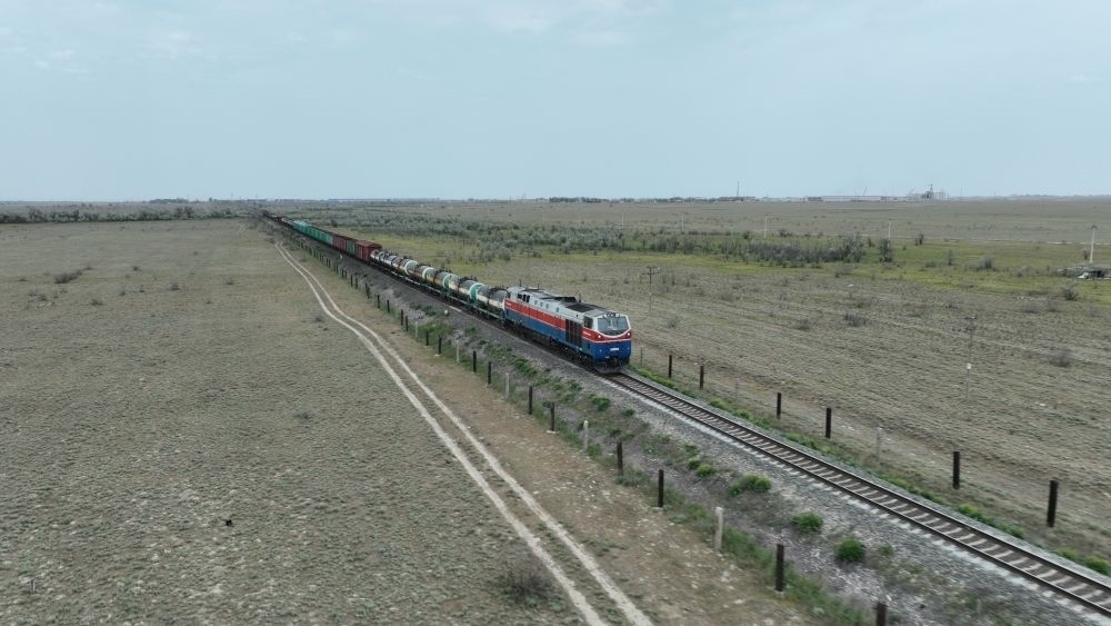 2023年5月12日,在哈薩克斯坦阿拉木圖附近,貨運(yùn)列車(chē)馳騁于阿拉木圖與霍爾果斯間(無(wú)人機(jī)照片)。新華社發(fā)(奧斯帕諾夫攝)