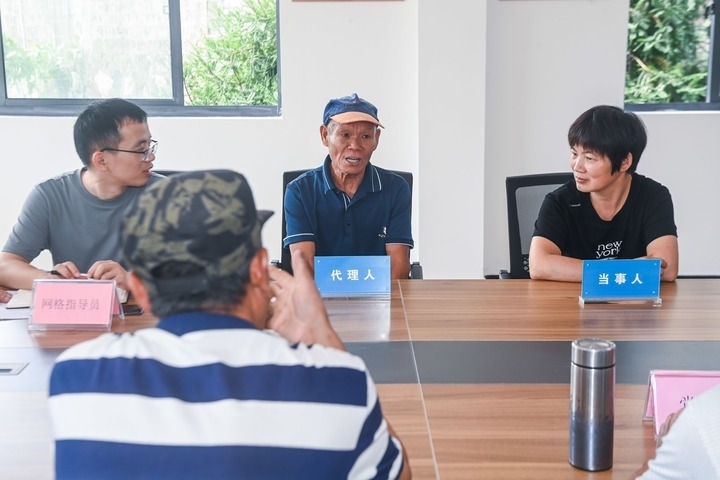 2023年7月26日,在浙江省諸暨市東白湖鎮(zhèn)婁東村新時代文明實踐站的文明共富會客廳內(nèi),網(wǎng)格長召集村里矛盾雙方當(dāng)事人以及黨員代表、鄉(xiāng)賢代表、人大代表等成員進(jìn)行宅基地指標(biāo)糾紛的現(xiàn)場調(diào)解。新華社記者 徐昱 攝