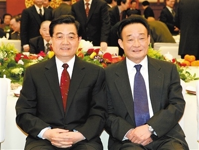 二〇〇五年一月一日,全國(guó)政協(xié)在北京舉行新年茶話(huà)會(huì)。這是胡錦濤同志與吳邦國(guó)同志在一起。新華社記者 樊如鈞攝