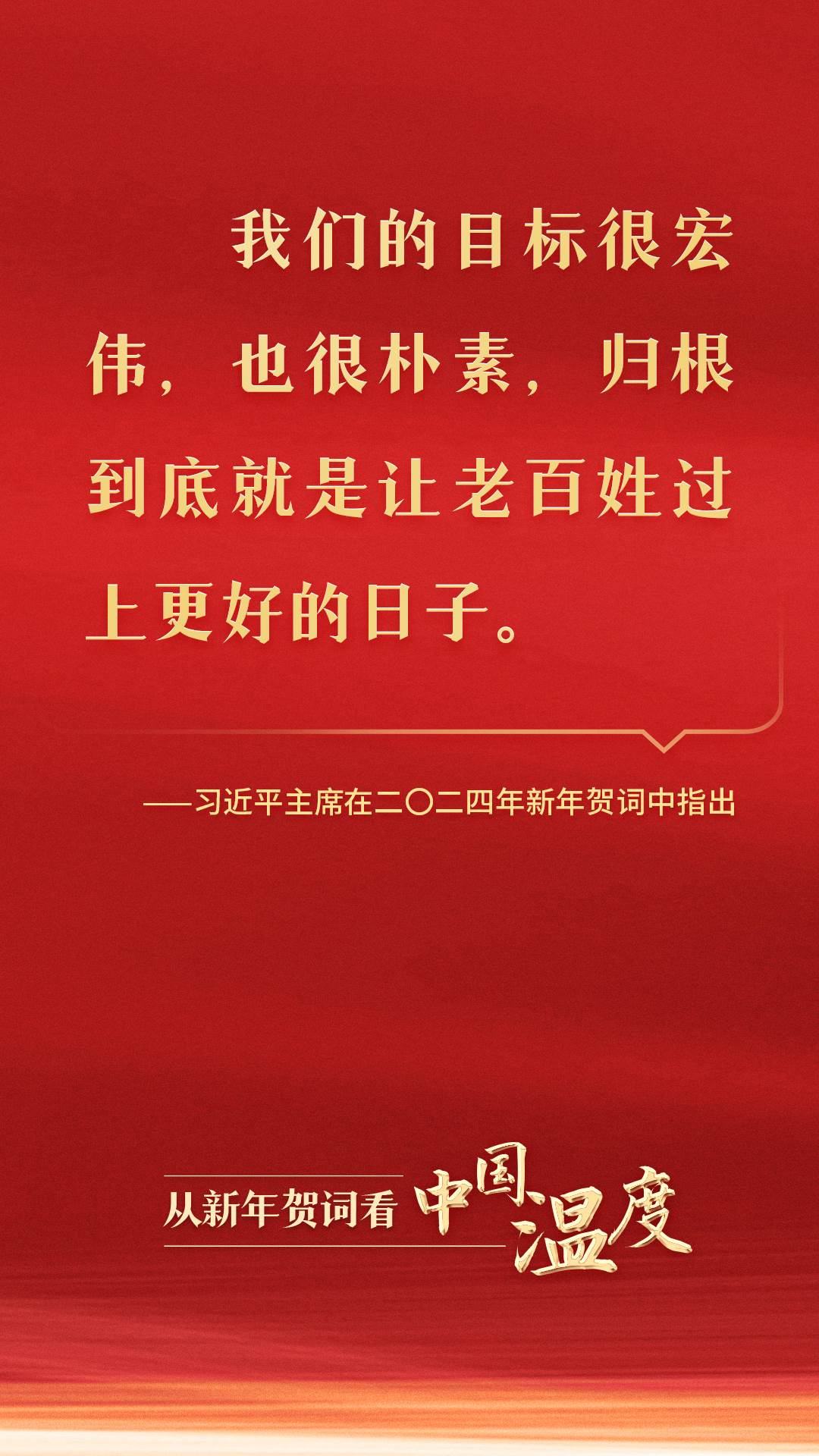 從黃土地走來,從大隊(duì)黨支部書記到黨和國(guó)家最高領(lǐng)導(dǎo)人,習(xí)近平同志深諳國(guó)情、社情、民情。在二〇二四年新年賀詞中,習(xí)近平主席話語懇切:“我們的目標(biāo)很宏偉,也很樸素,歸根到底就是讓老百姓過上更好的日子。”