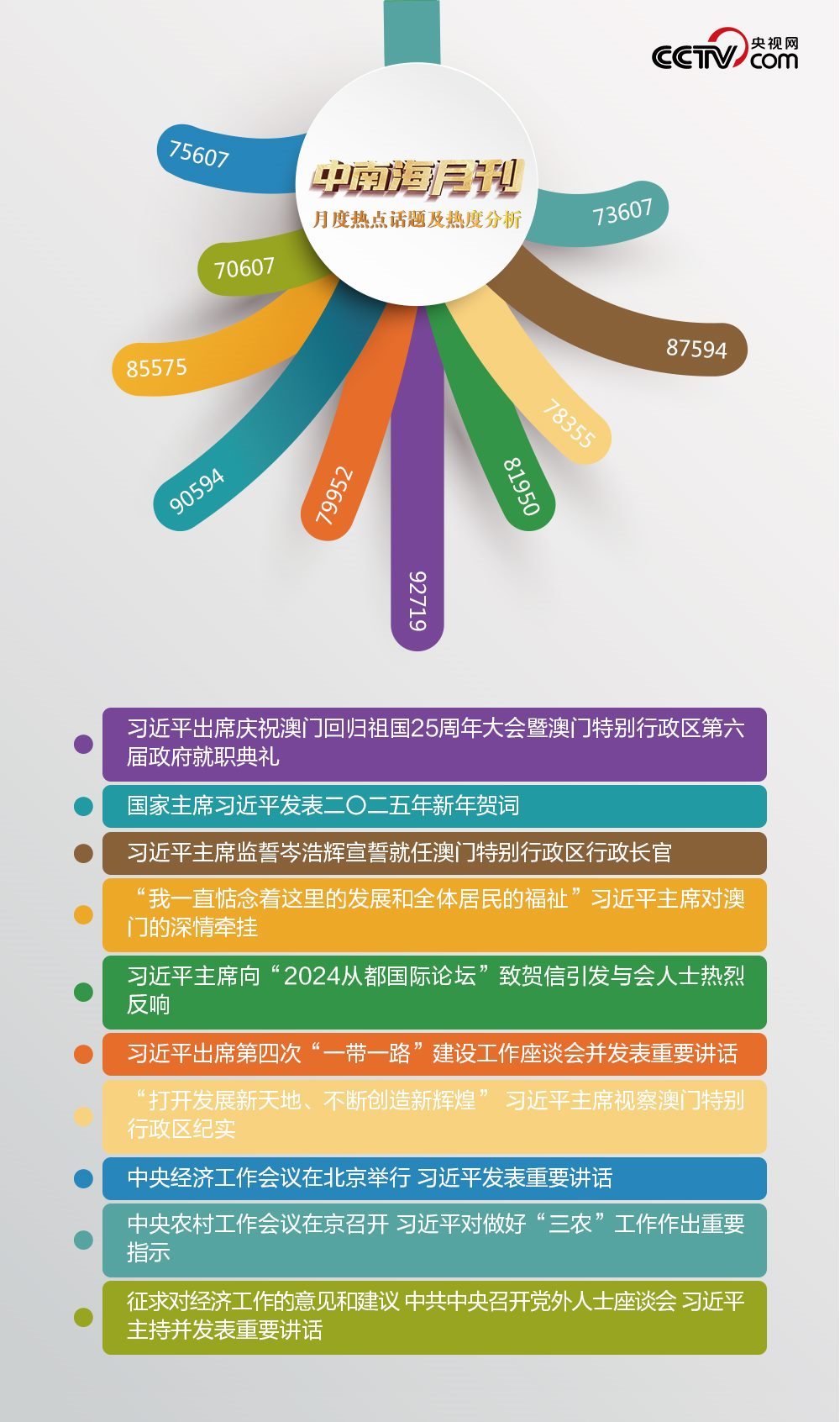南海風起,百舸爭流。盛世蓮花,灼灼生華。央視網(wǎng)“智聞”系統(tǒng)提取分析2024年12月全網(wǎng)時政新聞熱點,習近平主席澳門之行吸引全網(wǎng)關注。