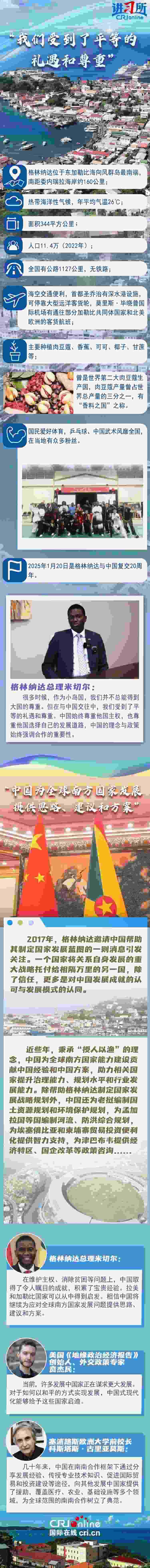 今年是格林納達與中國復交20周年。20年來,中格關系穩(wěn)定發(fā)展,雙方相互尊重、平等相待,政治互信不斷鞏固,各領域務實合作成果豐碩……樹立了大小國家平等相待、守望相助、互利共贏的典范。