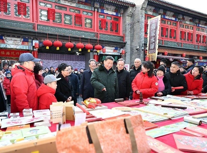 2024年春節(jié)前夕,總書(shū)記來(lái)到天津古文化街。在泥人張店鋪,他仔細(xì)觀看手藝人修復(fù)“孔子撫琴”的泥塑,感慨道:“一代代接續(xù)的工匠精神,讓文脈得以綿延不息?!痹诮诌叺臈盍嗄景婺戤?huà)店鋪,他端詳“勾、刻、印、繪、裱”道道工藝,贊賞道“連年有余,寄托了人們對(duì)美好生活的向往”。