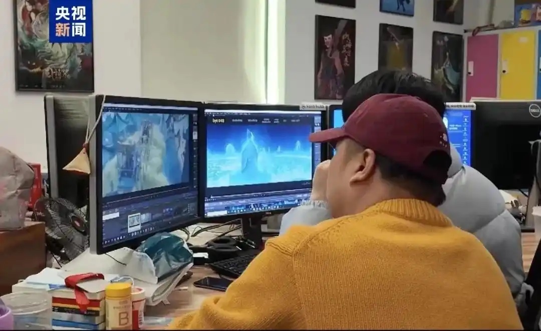 △《哪吒2》壯觀的特效背后,是全國138家動畫公司的合力托舉。圖為創(chuàng)作團(tuán)隊(duì)正在確認(rèn)畫面效果。