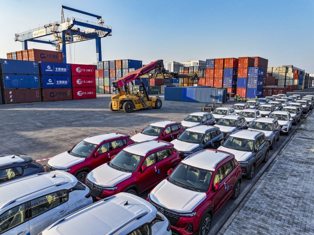 2024年10月28日在重慶國際物流樞紐園區(qū)西部陸海新通道重慶無水港拍攝的出口汽車裝運現場(無人機照片)。位于重慶市沙坪壩區(qū)的重慶國際物流樞紐園區(qū),是重慶中歐班列、西部陸海新通道班列、渝滿俄班列、渝甬班列的主要到發(fā)點,截至2024年10月,已開通班列線路62條,輻射125個國家和地區(qū)的542個港口。