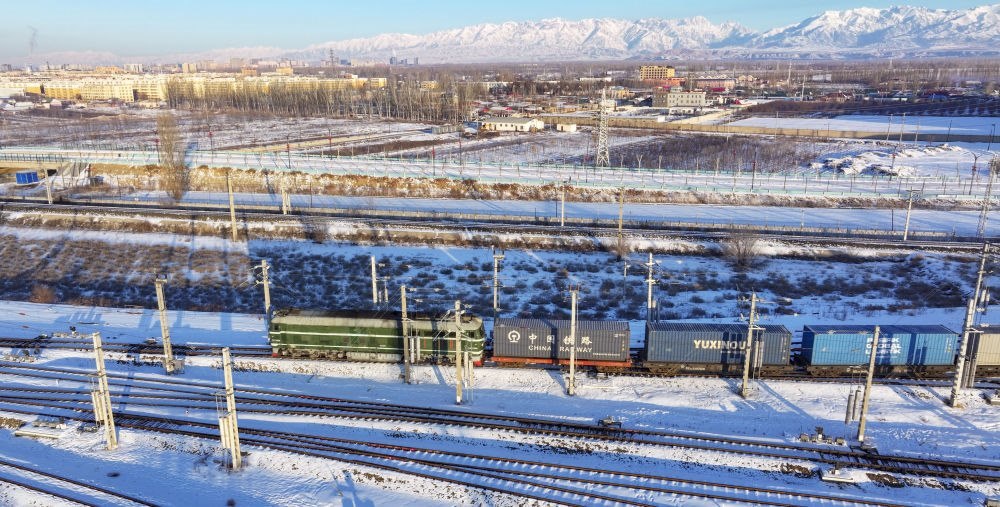 2024年12月25日,一列中歐班列經霍爾果斯口岸駛向哈薩克斯坦(無人機照片)。霍爾果斯口岸地處伊犁哈薩克自治州、毗鄰哈薩克斯坦,是古絲綢之路北道上的千年驛站,也是近現代對外開放的百年口岸,更是我國面向中亞、西亞乃至歐洲的重要物流通道。2024年,該口岸中歐(中亞)班列開行量達8730列,同比增長12.5%;貨物過貨量達1208.4萬噸,同比增長10.9%;通行班列線路總數超過80條,輻射境外18個國家的46個城市。