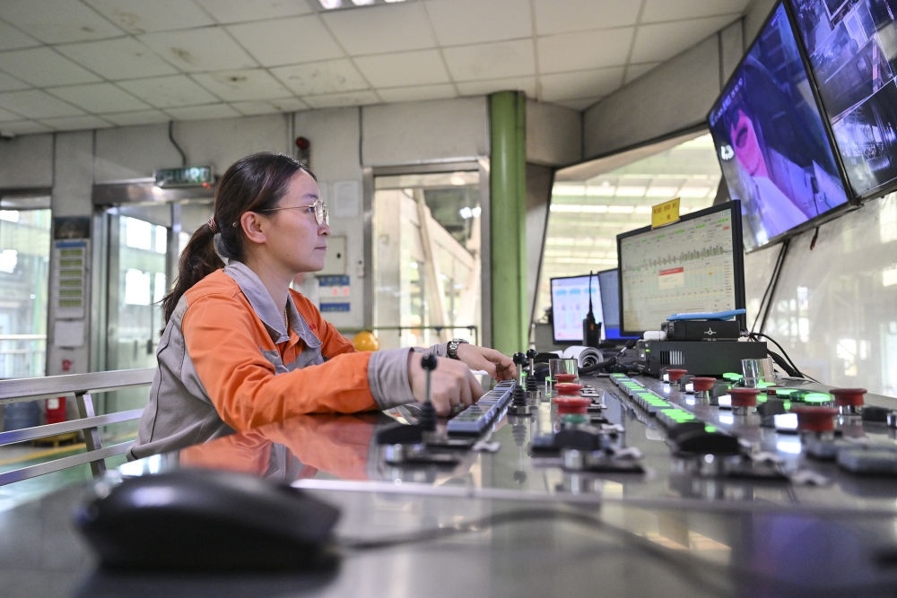 2024年6月13日,在馬來西亞彭亨州馬中關(guān)丹產(chǎn)業(yè)園聯(lián)合鋼鐵(大馬)集團(tuán)公司工廠,中國員工在智能控制室工作。