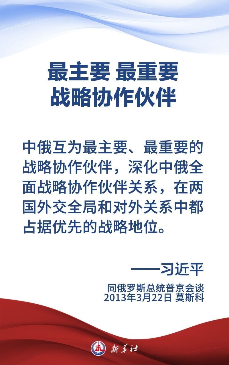 中俄關(guān)系歷經(jīng)風(fēng)雨,歷久彌堅(jiān),樹立了大國、鄰國永久睦鄰友好、全面戰(zhàn)略協(xié)作、互利合作共贏的典范。習(xí)近平主席和普京總統(tǒng)保持密切交往,為新時(shí)代中俄關(guān)系作出頂層設(shè)計(jì),提供戰(zhàn)略引領(lǐng)。在國事訪問等重要場合,習(xí)近平主席這樣論述中俄關(guān)系——