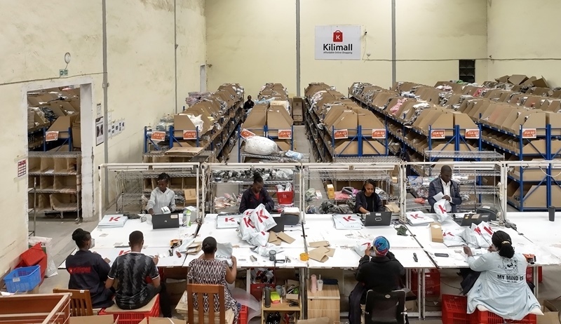 2023年4月20日,在肯尼亞姆洛隆戈,Kilimall員工在倉庫內(nèi)包裝商品出庫。新華社發(fā)(辜鵬博?攝)